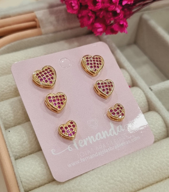 Trio coração cravejado com zirconias vermelhas banhado a ouro 18K