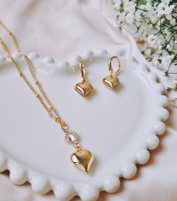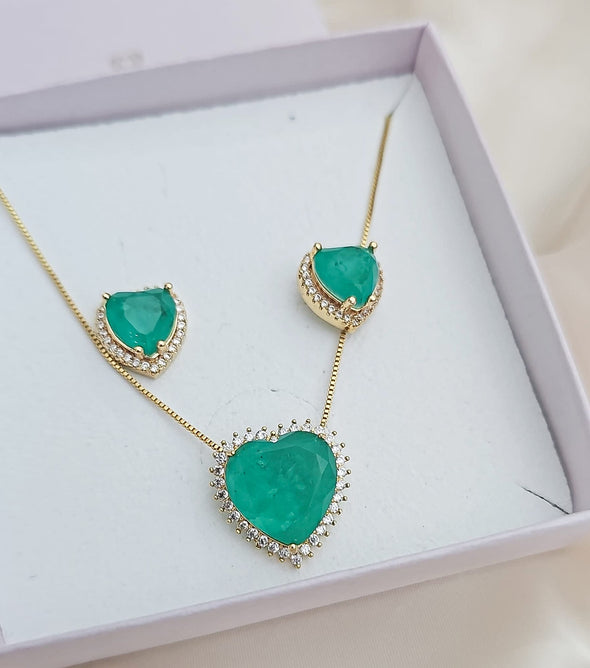 Conjunto de coração com pedra verde e cravejado com zircônia banhados a ouro 18K