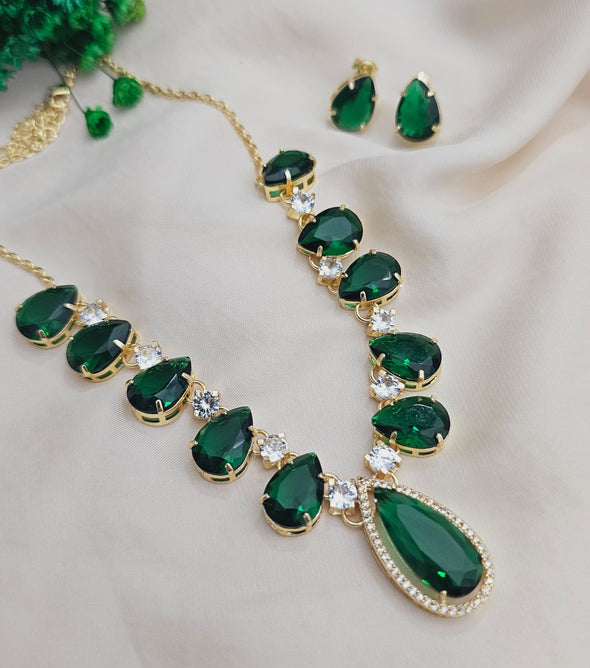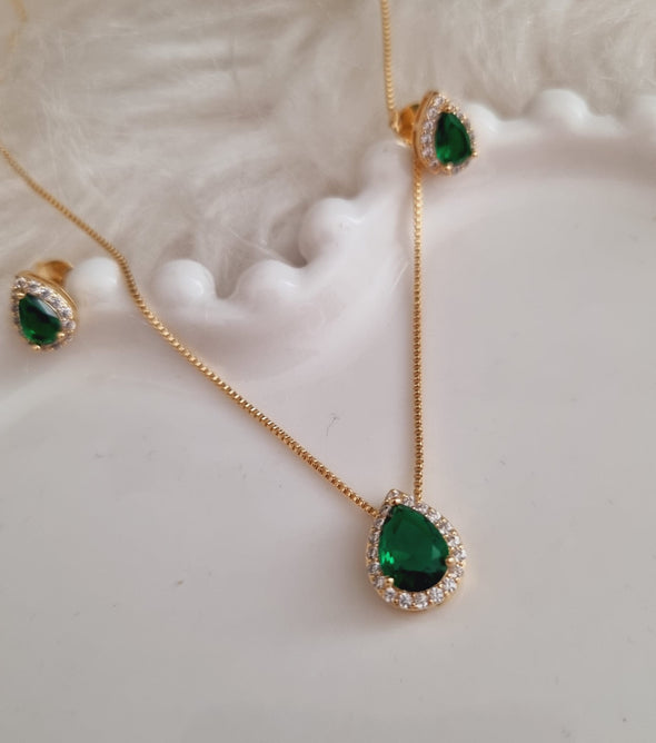 Conjunto cravejado com zirconias e pedra verde gota banhado a ouro 18k