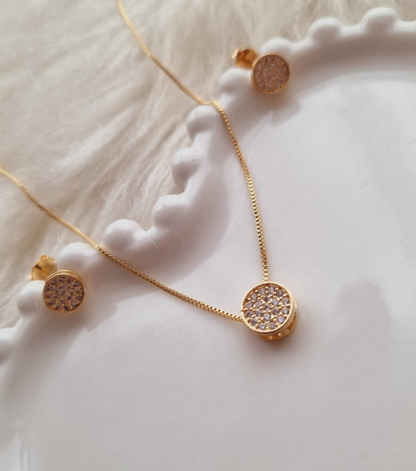 Conjunto redondo cravejado com zirconias banhado a ouro 18k