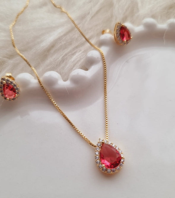 Conjunto gota vermelha cravejado com zirconias banhado a ouro 18k