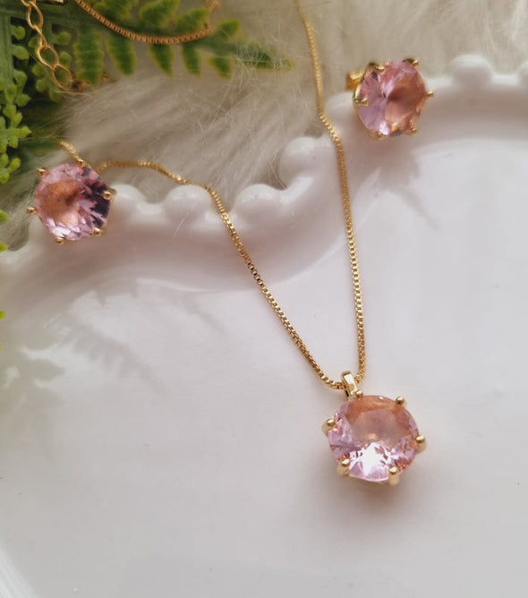 Conjunto redondo com zirconia rosa banhado a ouro 18k