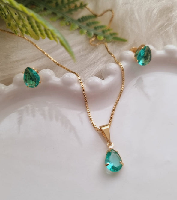 Conjunto gota com zirconia verde agua banhado a ouro 18k