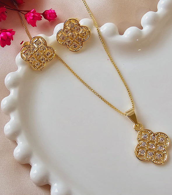 Conjunto trevo cravejado com zircônia banhado a ouro 18K