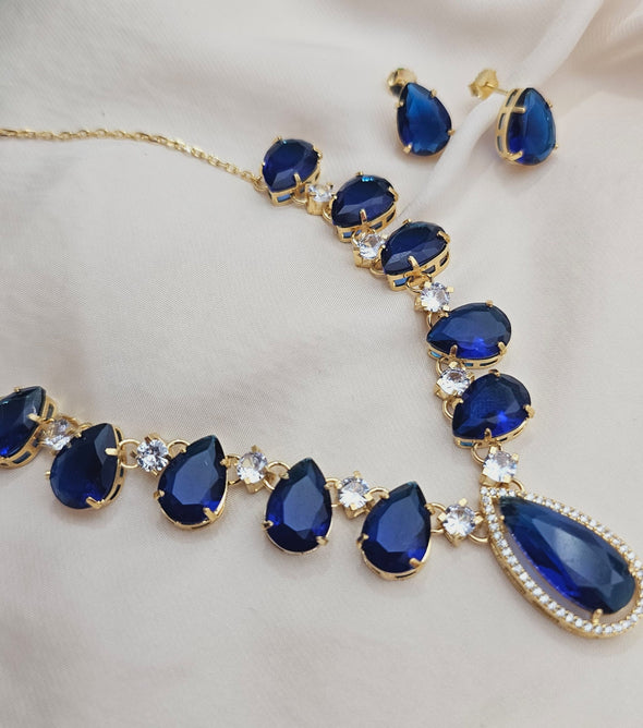 Conjunto colar e brinco com zirconias azul banhado a ouro 18k