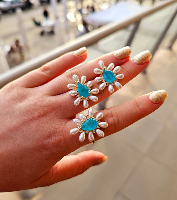 Conjunto brinco e anel com pedra verde e perolas banhado a ouro 18k